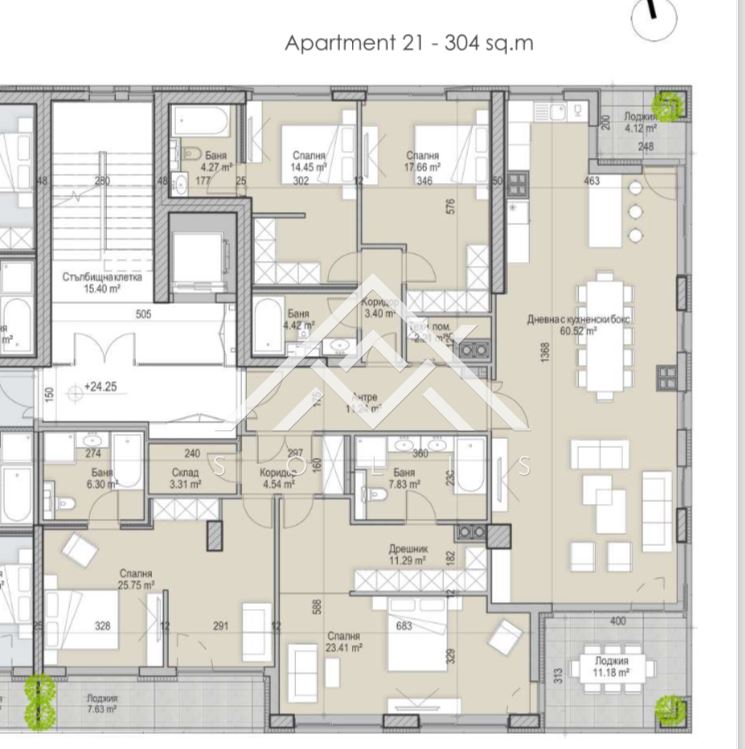 The multi-room apartment, located on the ninth floor of the building, has a floor area of 304 sq.m. and the following layout: